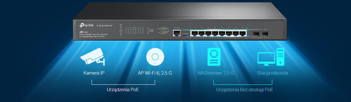 Przełącznik wyposażony jest w 8 portów PoE+ o prędkości 2,5 Gb/s, dlatego już teraz jest gotowy do budowy sieci przyszłości, zapewniając wystarczającą przepustowość do obsługi punktów dostępowych Wi-Fi 6. Możliwość przesyłu danych i zasilania za pomocą jednego kabla Ethernet i 240 W łącznej mocy zasilania PoE sprawiają, że znalezienie odpowiedniej lokalizacji dla przełącznika nie jest problematyczne. Aby zapewnić lepszą transmisję dźwięku i wideo w jednym ruchu sieciowym, administratorzy sieci mogą określić priorytety np. dla poszczególnych adresów IP, adresów MAC, portów TCP lub UDP itd. Dzięki temu transmisja dźwięku i wideo jest płynna i bez opóźnień.